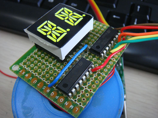 由于2个米字形LED含有16多个独立的LED需要独立控制,RP USB Connector上并没有如此多空闲IO口。因此这里的做 法是很传统的采用74595串行转并行输出芯片。RP USB Connector上通过SPI总线进行控制。